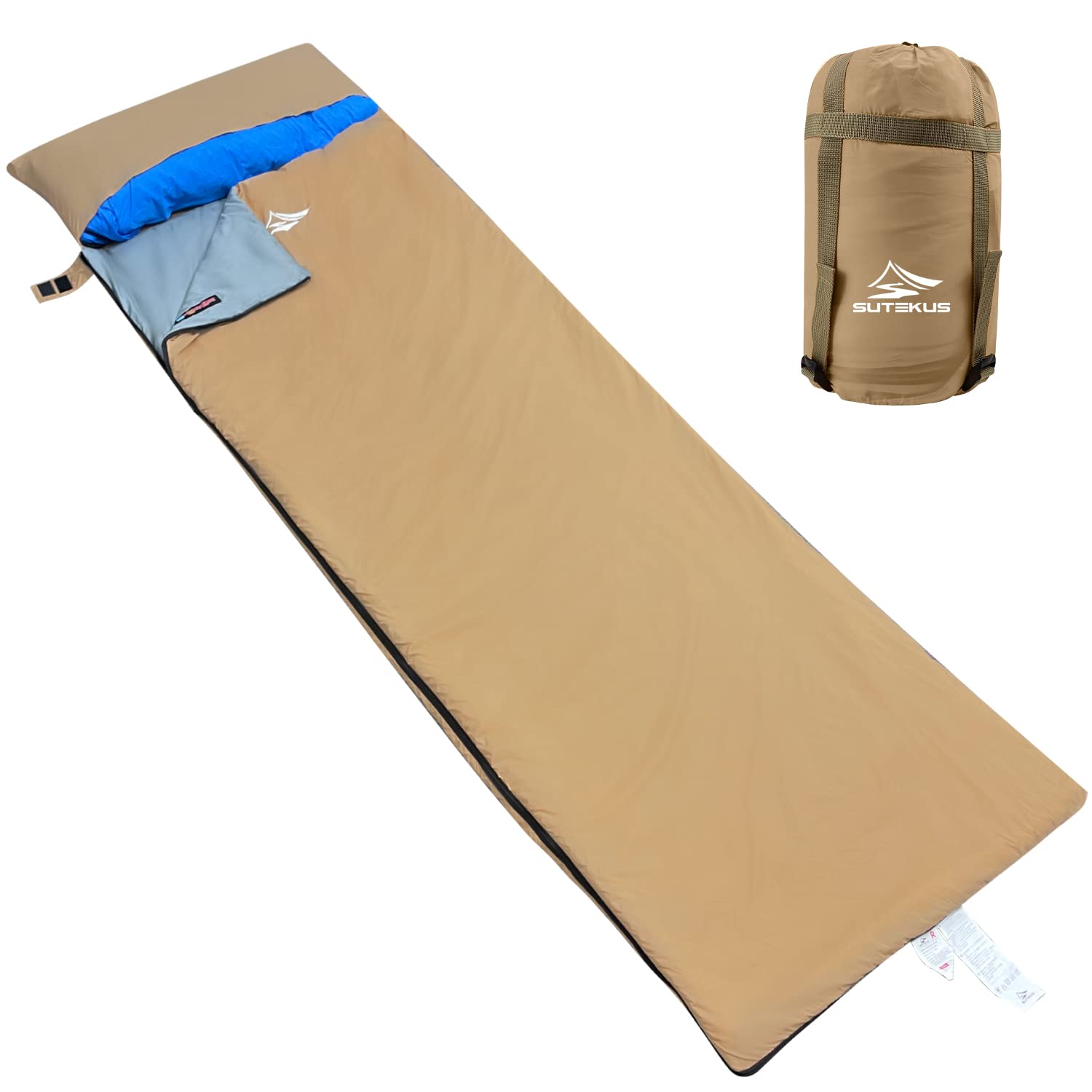 【送料無料】Sutekus 寝袋 シュラフ アウトドアキャンプ コンパクト 超軽量 スリーピングバッグ 封筒型 枕カバー付き 最低使用温度 8度 快適温度15度 色:カーキ、サイズ:190cm x 75cm