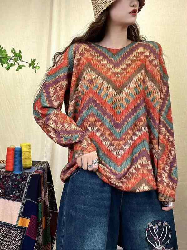 ニット レディース ファー セーター プルオーバー ゆったり 幾何学模様 ラウンドネック 長袖 ニットトップス レトロ 秋冬 普段使い 部屋着(x5)